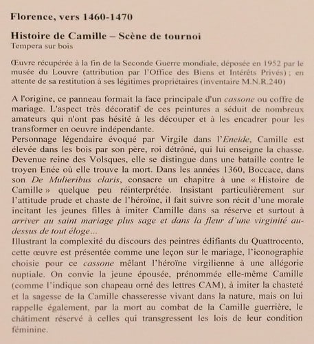 Description présente sur Flickr : « Camille est une reine légendaire des Volsques, peuple italique du Latium en Italie ( région de Rome). Elle est évoquée par Virgile dans l’Enéide où elle trouve la mort dans un combat contre Enée. Les Latins se sont opposés aux Volsques jusqu’au milieu du 4è siècle avant notre ère. Puis ils se sont ralliés et ont été intégrés dans la République romaine.